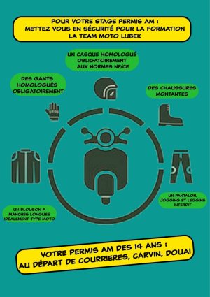 La formation au permis AM s'effectue désormais en 8 heures, en 2 parties de 4 heures et toujours sans examen final. Sur notre site, vous retrouverez nos dates de stages avec une inscription en 2 parties, une rubrique P1 pour le plateau et une rubrique P2 pour la circulation. Gérez comme vous voulez les 2 phases p1 et p2, vous pouvez commencer a Courrieres et vous inscrire ensuite a Carvin, Douai ou Arleux Vous pouvez régler d'abord le premier stage P1 et ensuite le deuxième P2 plus tard en choisissant la date, cela vous permettra de mieux maîtriser le coût de la formation. A l'issue, une attestation de fin de formation vous sera délivrée. Le dossier est enregistré ensuite par nos soins sur le site ANTS, pas de tracas pour vous ! Un équipement de sécurité obligatoire a chacun : pour les 2 parties du stage un équipement complet est désormais obligatoire :un casque homologué un blouson renforcé type moto , des gants normes NF, CE, des bottes ou des chaussures montantes, d'un pantalon de type jean : EN CAS D'EQUIPEMENT NON CONFORME LA FORMATION NE PEUT AVOIR LIEU